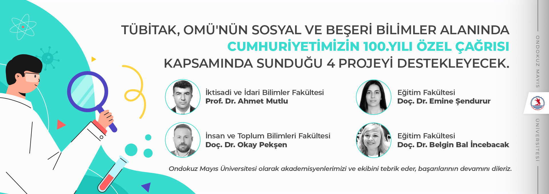 Sosyal ve Beşeri Bilimler Araştırmalarına yönelik yapılan değerlendirme sonucunda 90 proje önerisinin desteklenmesine karar verildi. Bu çağrı kapsamında Ondokuz Mayıs Üniversitesinden (OMÜ) 4 proje destek almaya hak kazandı. TÜBİTAK-1001 çerçevesinde destek almaya hak kazanan projelerimiz: