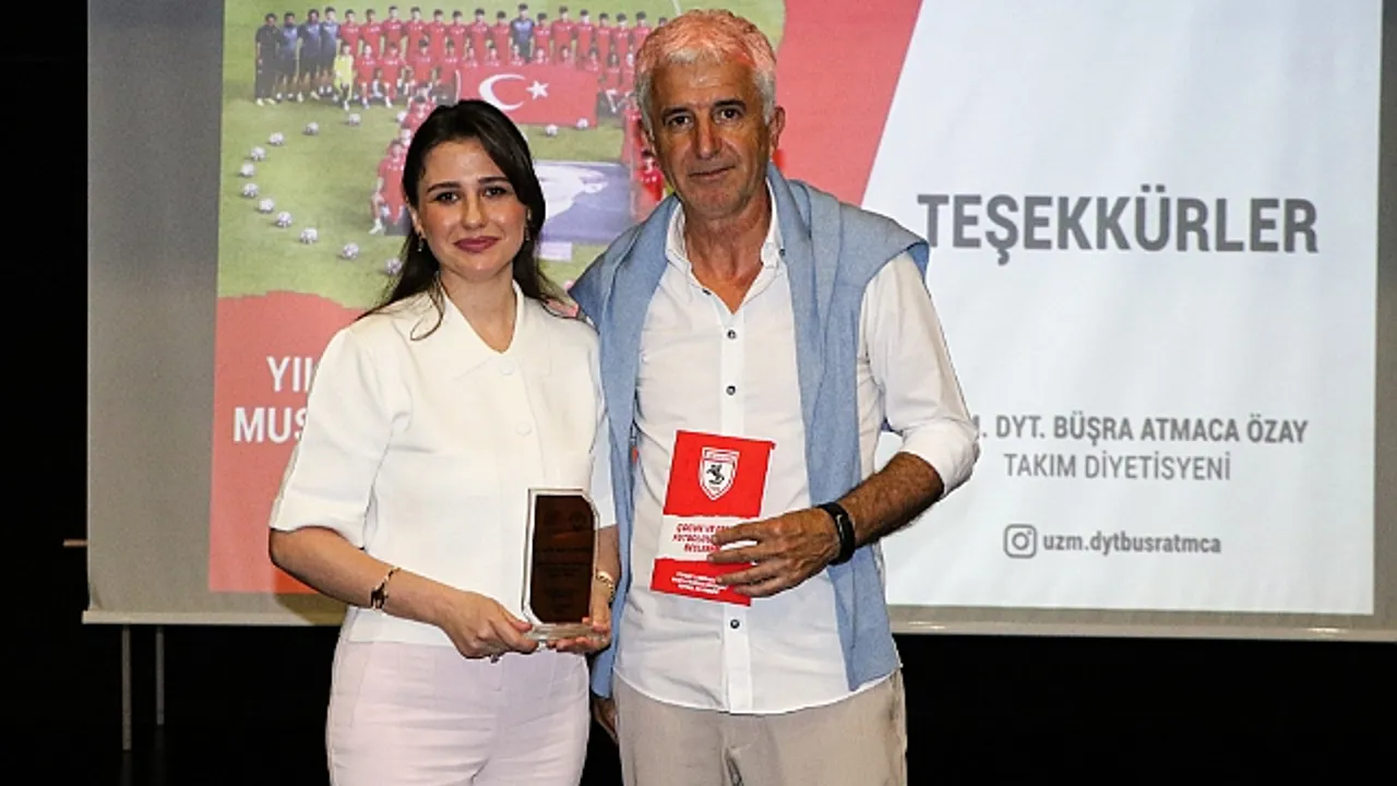 Seminer sonrası Futbol Akademi Dİrektörü Yücel Uyar ve Yılport Samsunspor Diyetisyeni Büşra Atmaca Özay 'a plaket taktim ettiler.