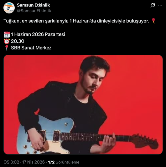 Şarkıcı Tuğkan, 1 Haziran 2026 tarihinde Samsun’da konser verecek. “Samsun Etkinlik” tarafından yapılan duyuruya göre Tuğkan, en sevilen şarkılarıyla dinleyicileriyle buluşacak.
