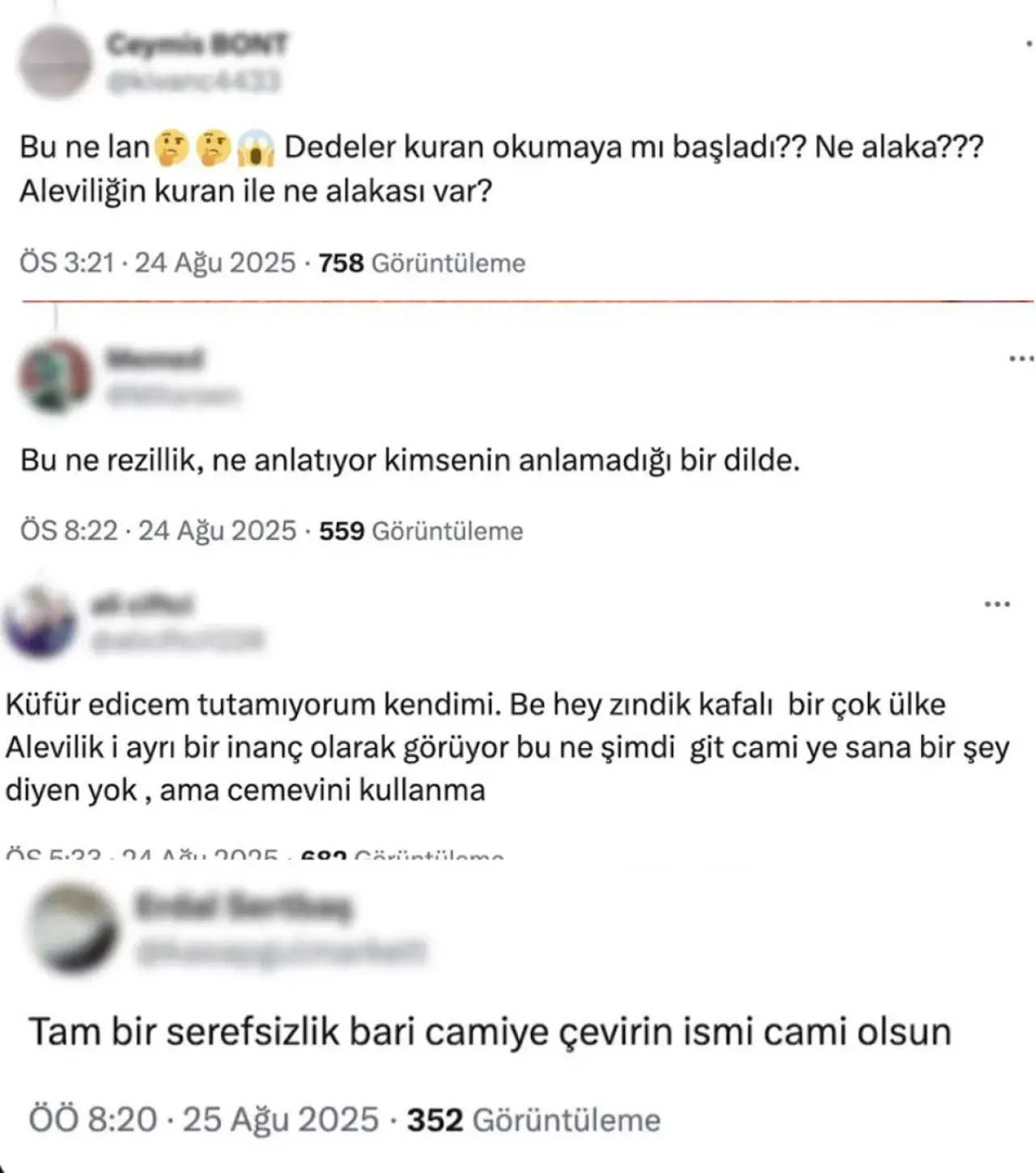 Tunceli’de bir cemevinde görevli dede Ali Ekber Yurt’un Kur’an-ı Kerim okuduğu anlar sosyal medyada tartışma yarattı. Görüntüleri paylaşan bir X kullanıcısının notuyla başlayan paylaşımın ardından, dedeye ve onu dinleyenlere hakaretler yağdı. Olay, Alevilik ve dini ritüeller üzerine sosyal medyada geniş yankı uyandırdı.