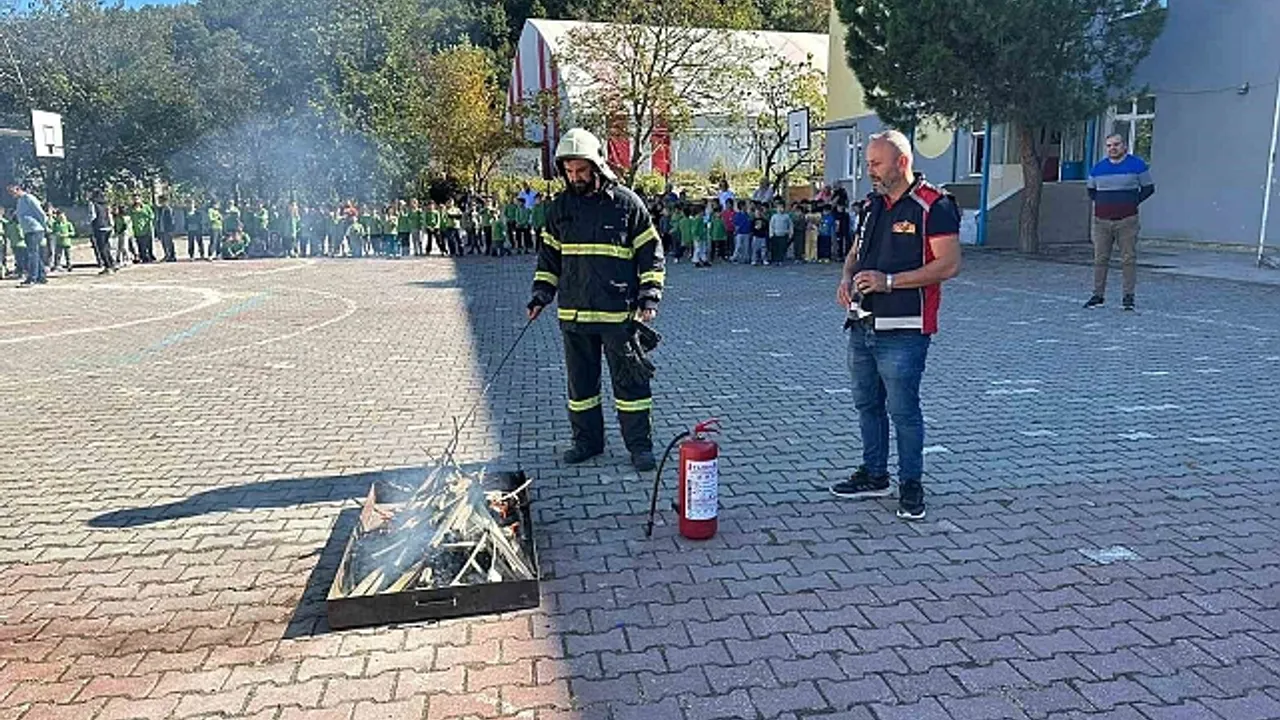 İlk olarak yangın alarmı verilerek, öğrencilerin okuldan düzenli bir şekilde tahliye edilmesi sağlandı. Son olarak boş bir kap içerisine dökülen benzin yakılarak, yangın tüpü ile nasıl müdahale edilmesi gerektiği gösterildi. Bu müdahaleyi öğrenciler de uyguladı.