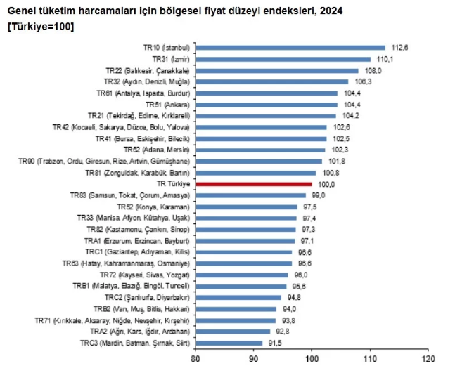 TÜİK’in 2024 yılı Bölgesel Satınalma Gücü Paritesi sonuçlarına göre, Türkiye genelinde fiyat düzeyi en yüksek bölge İstanbul olurken, en düşük fiyat düzeyi Mardin, Batman, Şırnak ve Siirt’i kapsayan TRC3 bölgesi oldu. Samsun’un da yer aldığı TR83 Bölgesi (Samsun, Tokat, Çorum, Amasya) ise genel olarak Türkiye ortalamasına yakın bir fiyat seviyesinde konumlandı.