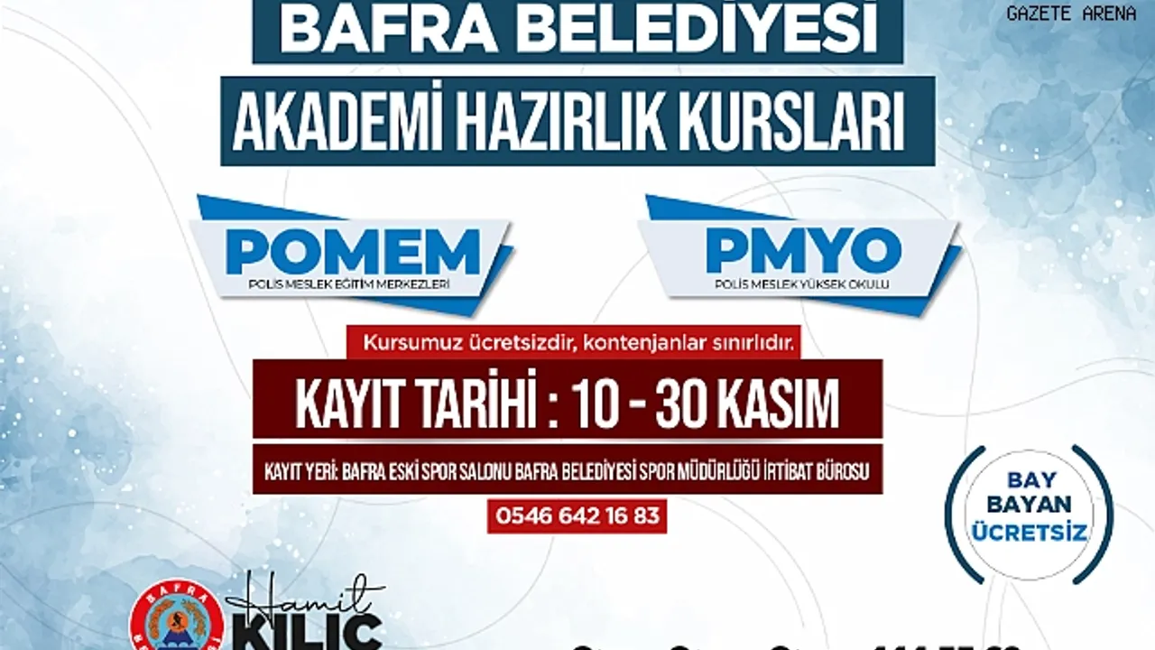 Polis Meslek Eğitim Merkezleri (POMEM) ve Polis Meslek Okulu (PMYO) kurslarına katılmak isteyenler kayıtlarını eski Kapalı Spor Salonu’nda yer alan Bafra Belediyesi irtibat bürosuna yaptıracaklar.