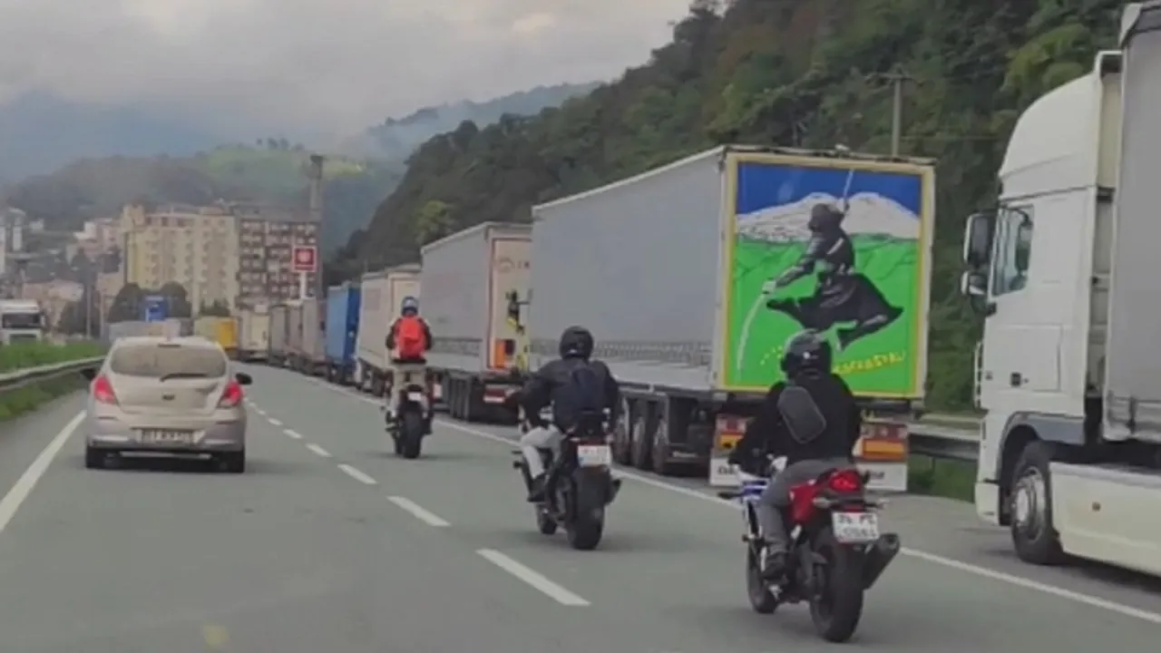 Karadeniz Sahil Yolu Arhavi-Hopa karayolu arasında kaydedilen tehlikeli yolculuğun görüntüsü dikkat çekti. Görüntülerde 3 şeritli karayolunun sağ şeridinde park halinde tırlar yer alırken, orta şeritte seyir halinde olan bir motosikletli grup görülüyor. En önde giden motosikletlinin ayakta ve direksiyon gidonunu bırakarak cep telefonu ile video çekmesi görenleri hayrete düşürdü.