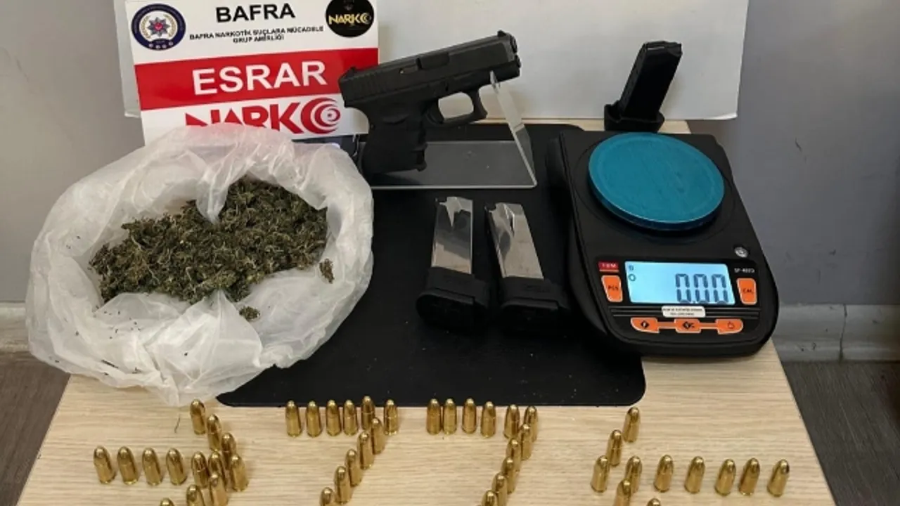 Bafra Cumhuriyet Başsavcılığı'nın koordinesinde Bafra Natkotik Büro Amirliği ekiplerince yapılan çalışmalar sonucunda F.G. ve C.C. isimli şahısların aracında ve Yaka Mahallesi'ndeki ikametinde yapılan aramalarda 44 gram esrar, 1 adet hassas terazi, 1 adet ruhsatsız tabanca ile 49 adet tabanca fişeği ele geçirildi. Olayla ilgili F.G. gözaltına alındı. Gözaltına alınan şahıs, Bafra Natkotik Büro Amirliğindeki işlemlerinin ardından sevk edildiği Bafra Adliyesinde tutuklanarak Bafra T Tipi Kapalı Cezaevine gönderildi.