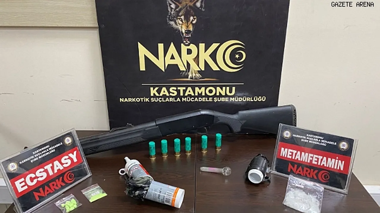 Edinilen bilgiye göre, Kastamonu İl Emniyet Müdürlüğü Narkotik Suçlarla Mücadele Şube Müdürlüğü ekiplerinin uyuşturucu madde kullanan ve satışını yapan kişilere yönelik çalışmaları devam ediyor. Bu çerçevede, bir şahsın üst ve aracında arama yapıldı. Yapılan aramada 24,26 gram metamfetamin, 16 adet ecstasy hap, 1,18 gram ecstasy tozu, 1 adet ruhsatsız av tüfeği ve 6 adet av tüfeği fişeği ele geçirildi.