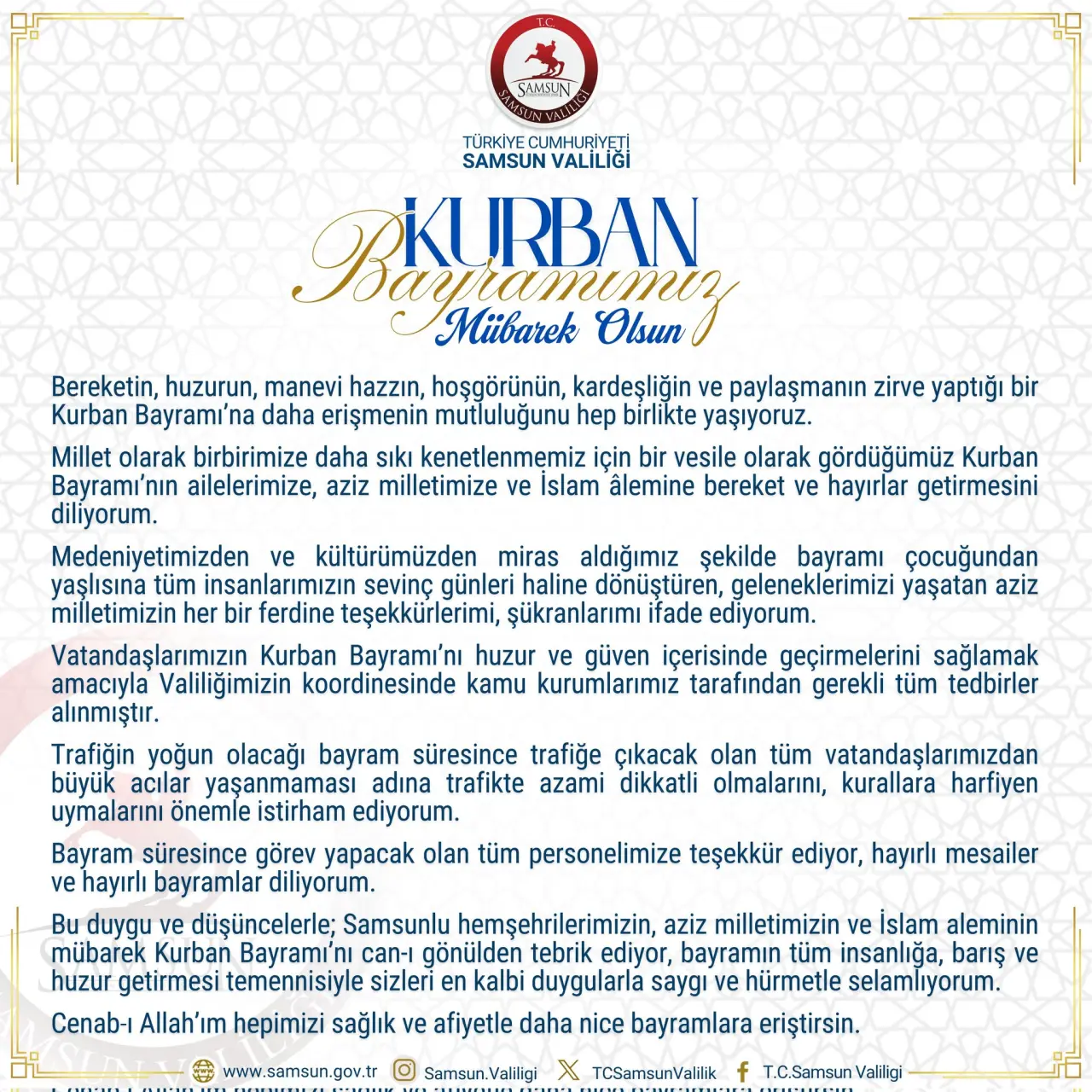 Bereketin, huzurun, manevi hazzın, hoşgörünün, kardeşliğin ve paylaşmanın zirve yaptığı bir #KurbanBayramı’na daha erişmenin mutluluğunu hep birlikte yaşıyoruz. Millet olarak birbirimize daha sıkı kenetlenmemiz için bir vesile olarak gördüğümüz Kurban Bayramı’nın ailelerimize, aziz milletimize ve İslam âlemine bereket ve hayırlar getirmesini diliyorum. Medeniyetimizden ve kültürümüzden miras aldığımız şekilde bayramı çocuğundan yaşlısına tüm insanlarımızın sevinç günleri haline dönüştüren, geleneklerimizi yaşatan aziz milletimizin her bir ferdine teşekkürlerimi, şükranlarımı ifade ediyorum. Vatandaşlarımızın Kurban Bayramı’nı huzur ve güven içerisinde geçirmelerini sağlamak amacıyla Valiliğimizin koordinesinde kamu kurumlarımız tarafından gerekli tüm tedbirler alınmıştır. Trafiğin yoğun olacağı bayram süresince trafiğe çıkacak olan tüm vatandaşlarımızdan büyük acılar yaşanmaması adına trafikte azami dikkatli olmalarını, kurallara harfiyen uymalarını önemle istirham ediyorum. Bayram süresince görev yapacak olan tüm personelimize teşekkür ediyor, hayırlı mesailer ve hayırlı bayramlar diliyorum. Bu duygu ve düşüncelerle; Samsunlu hemşehrilerimizin, aziz milletimizin ve İslam aleminin mübarek Kurban Bayramı’nı can-ı gönülden tebrik ediyor, bayramın tüm insanlığa, barış ve huzur getirmesi temennisiyle sizleri en kalbi duygularla saygı ve hürmetle selamlıyorum. Cenab-ı Allah’ım hepimizi sağlık ve afiyetle daha nice bayramlara eriştirsin.