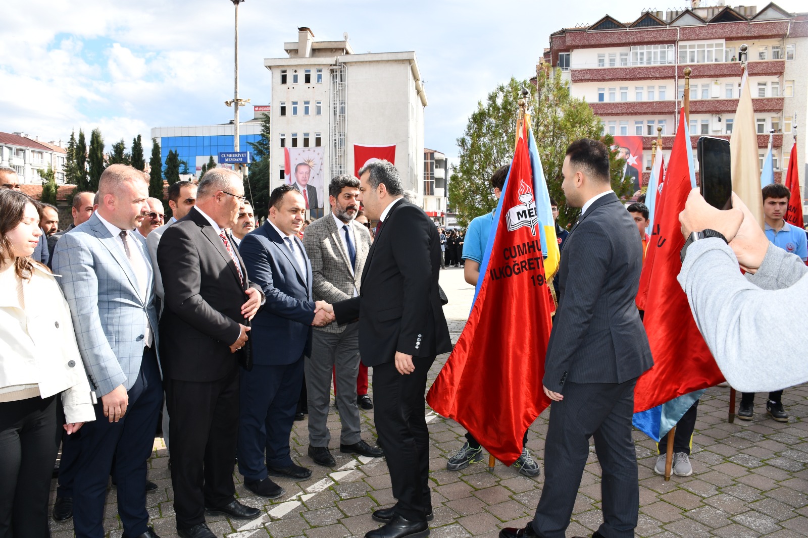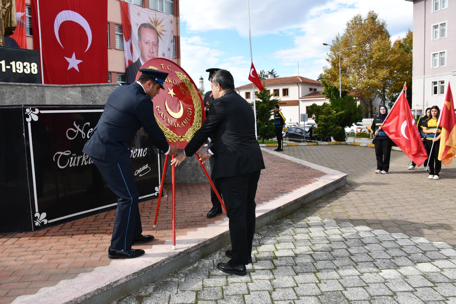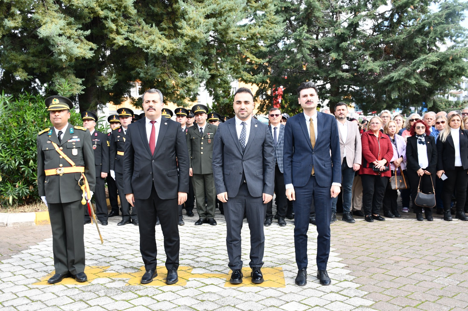 Kaymakam Özgür Kaya, Garnizon Komutanı Piyade Binbaşı Fırat Yılmaz ve Belediye Başkanı Murat Gül tarafından çelenklerin sunulmasının ardından Cumhuriyet'in kurucusu Gazi Mustafa Kemal Atatürk ve şehitler anısına saygı duruşunda bulunuldu, İstiklal Marşı okundu.
