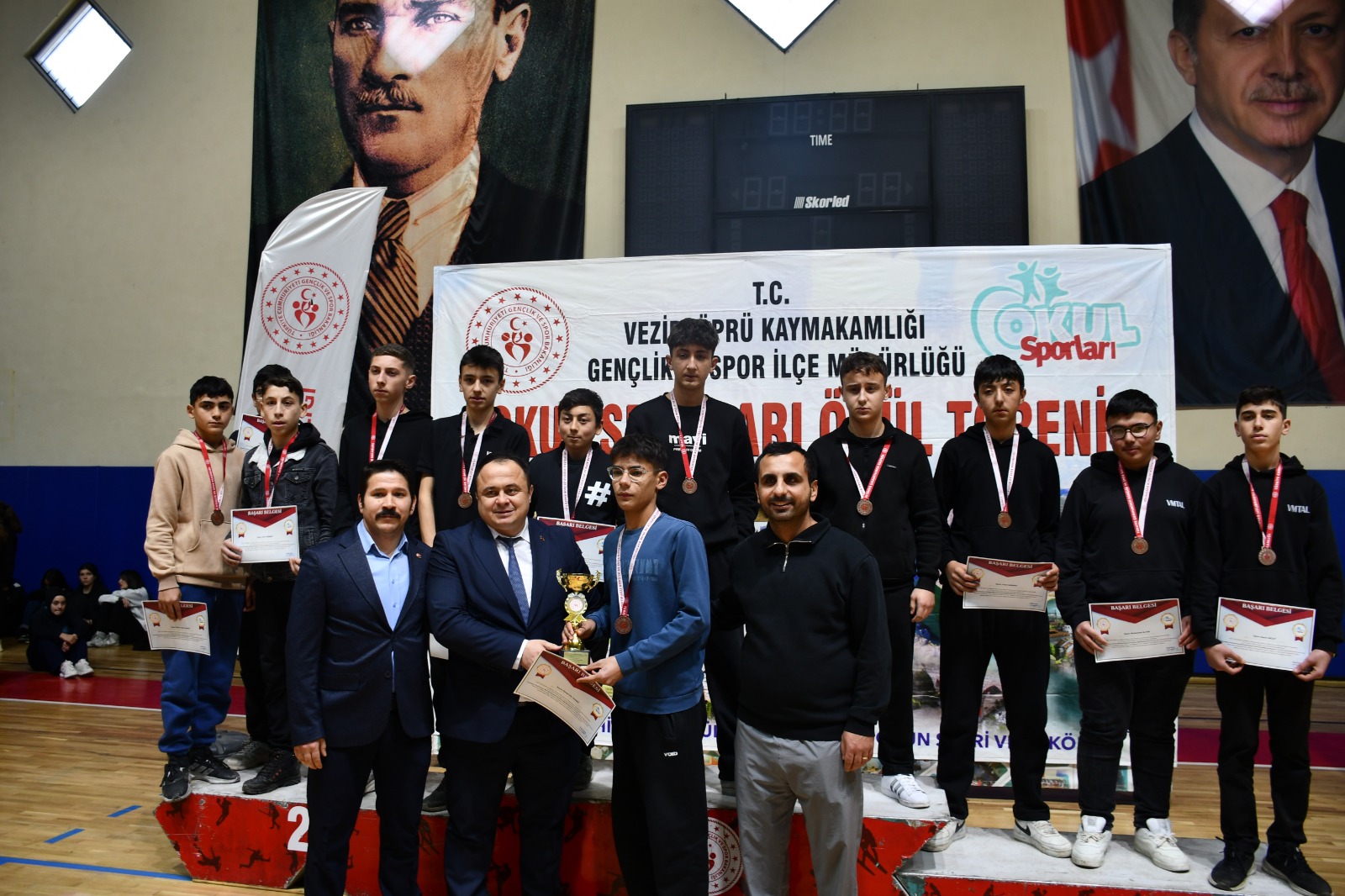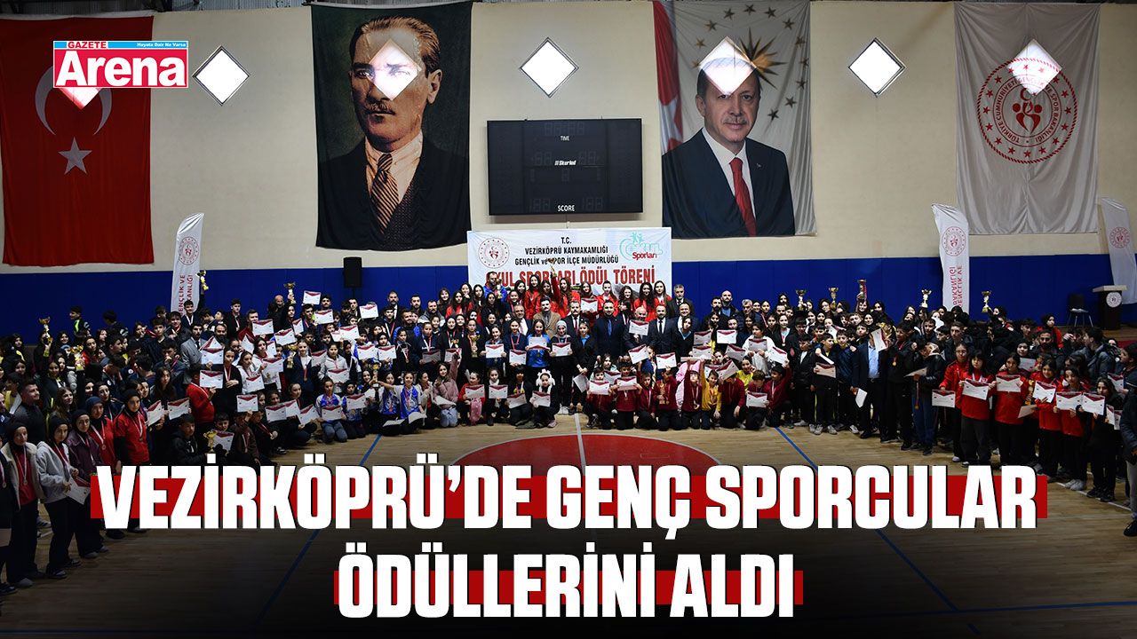 Samsun’un Vezirköprü ilçesinde okul sporları müsabakalarında başarı elde eden öğrenciler için ödül töreni düzenlendi. Gençlik ve Spor İlçe Müdürlüğü Kapalı Spor Salonu’nda gerçekleştirilen törende, farklı branşlarda dereceye giren sporcuların heyecanı ve mutluluğu gözlerden kaçmadı.