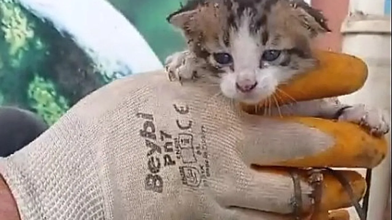 Yağmur borusuna sıkışan yavru kediyi market çalışanları kurtardı