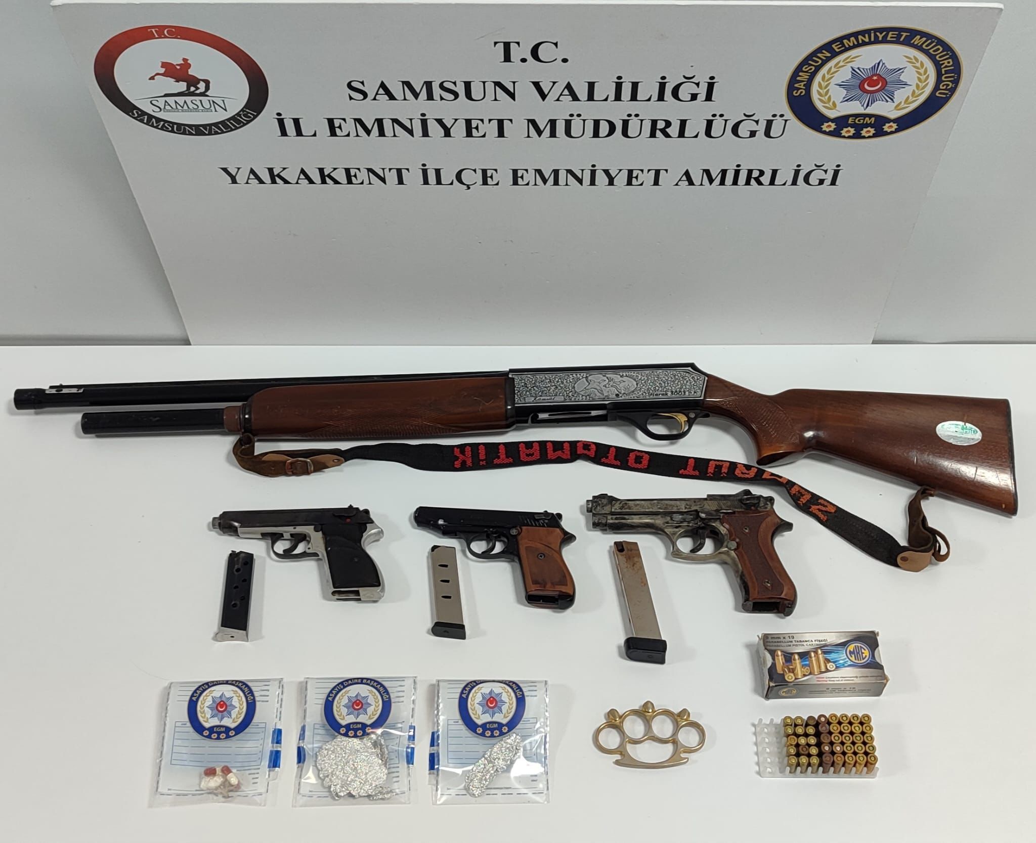 Operasyonda şüpheliler A.B. ve F.T'nin üzerlerinde, araçlarında ve ikametlerinde yapılan aramalarda 1,2 gram esrar, 5 adet sentetik ecza, 2,40 gram sentetik uyuşturucu ele geçirildi. Ayrıca 3 adet ruhsatsız tabanca, 40 adet tabanca fişeği, 1 adet muşta ile 1 adet ruhsatsız otomatik yivsiz av tüfeği bulundu.