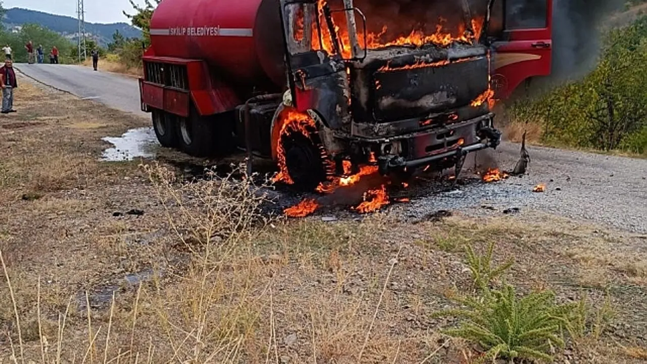 Çorum'un İskilip ilçesinde çıkan köy yangınına müdahale için harekete geçen İskilip Belediyesi'ne ait itfaiye aracı yolda alev alarak yandı.