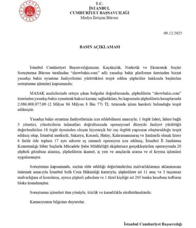 İstanbul merkezli düzenlenen kapsamlı operasyonla, “showbahis.com” isimli yasa dışı bahis platformunu yöneten suç örgütü çökertildi. Operasyon kapsamında toplam 2 milyar 86 milyon TL değerindeki yasa dışı servet bloke altına alındı.