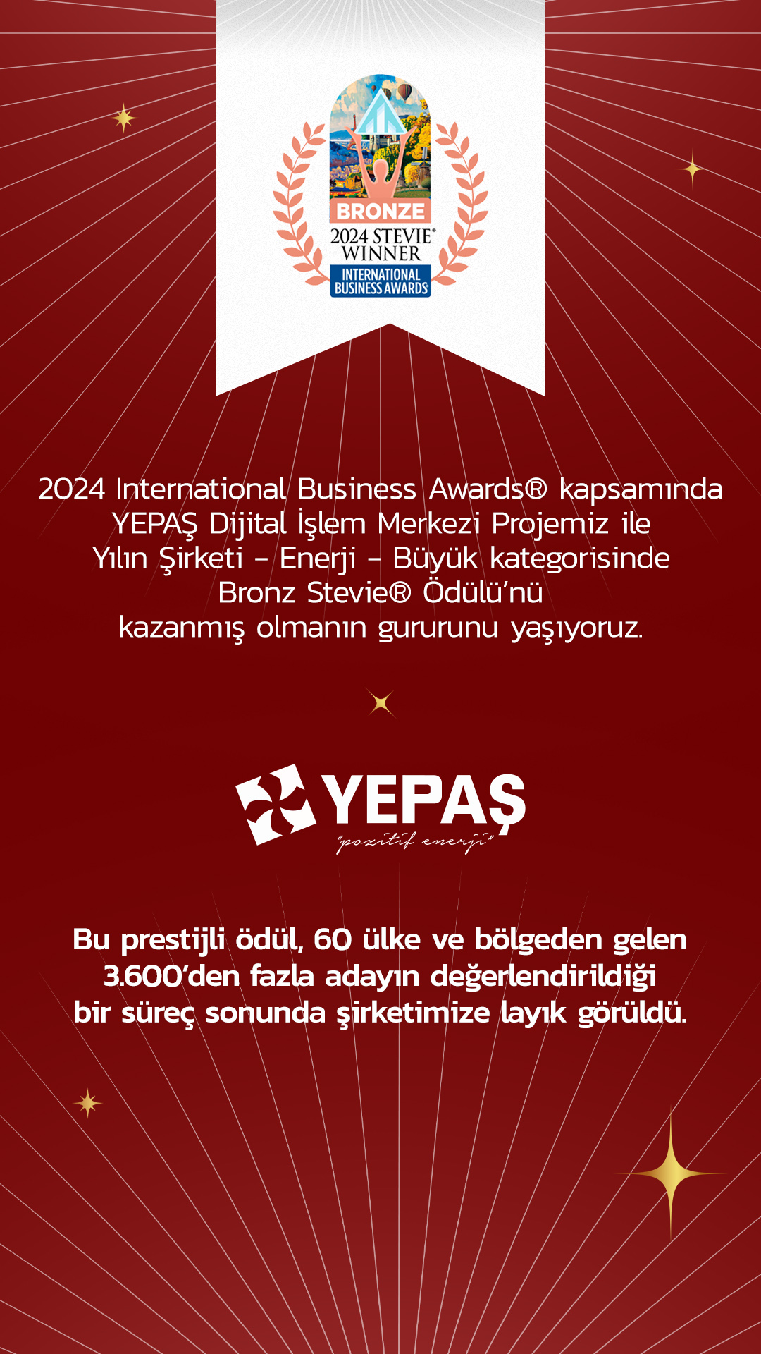 60’tan fazla ülke ve bölgeden gelen 3.600’ den fazla aday arasından seçilen YEPAŞ, 2024 International Business Awards kapsamında “Dijital İşlem Merkezi” Projesi ile Yılın Şirketi- Enerji” kategorisinde Bronz Stevie ödülünü almaya hak kazanmıştır.