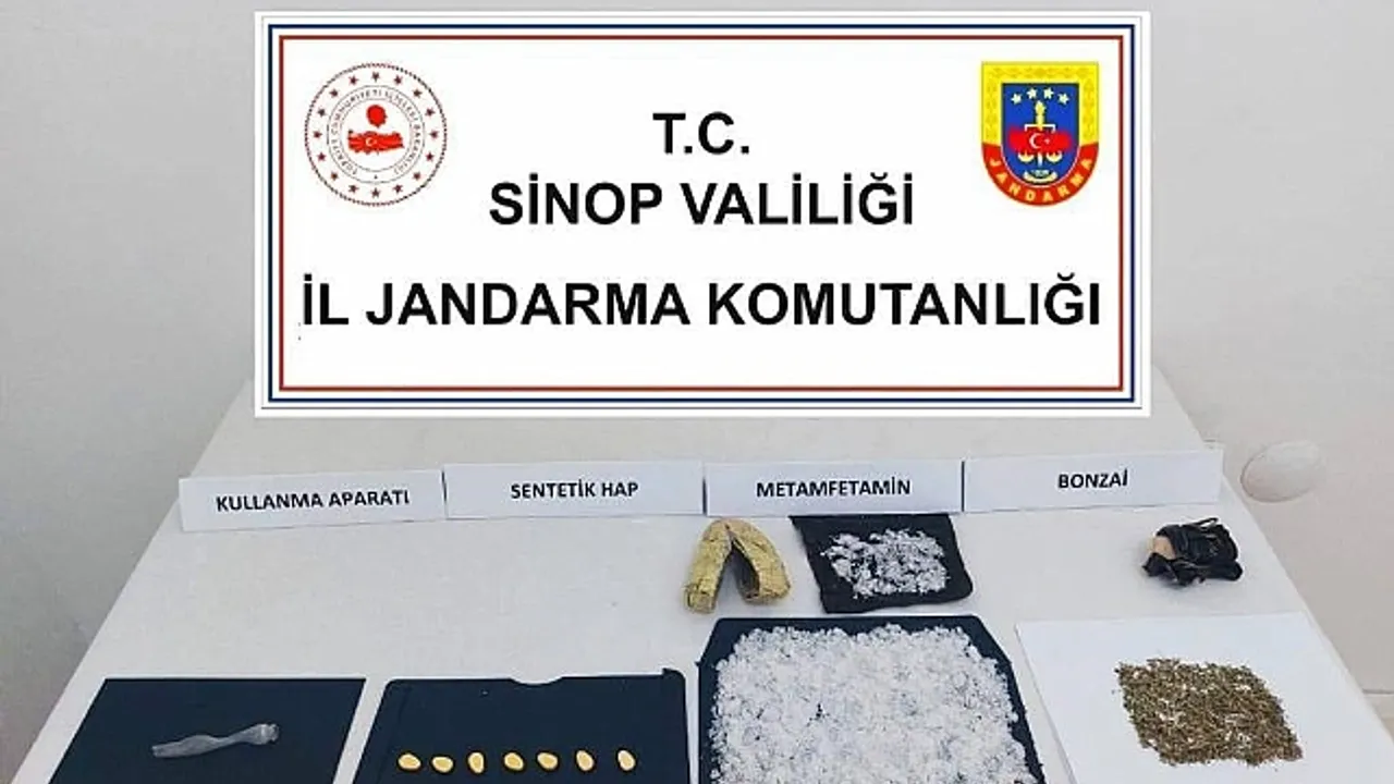 Sinop İl Jandarma Komutanlığı tarafından Sinop-Çorum karayolu üzerinde bir araçta yapılan aramada 80 gram metamfetamin, 5 gram bonzai, 7 adet sentetik hap ve 1 adet kullanıma aparatı elde edildi.