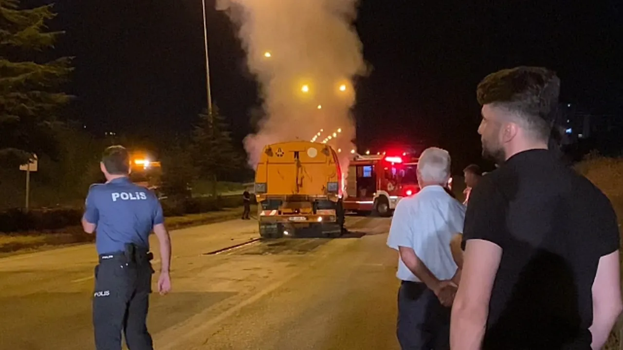 Yol süpürme aracı alevlere teslim oldu