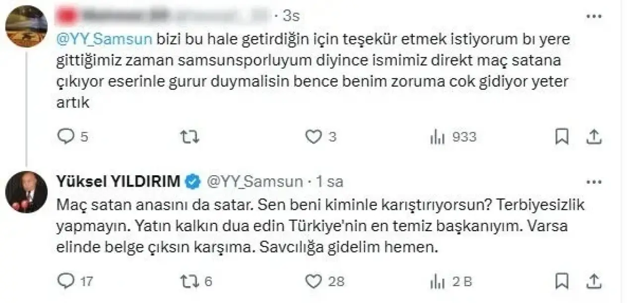 Reeder Samsunspor Kulübü Başkanı Yüksel Yıldırım, sosyal medya üzerinden kendisine yöneltilen eleştirilere sert bir yanıt verdi. Bir kullanıcı Yıldırım’a, "Bizi bu hale getirdiğin için teşekkür etmek istiyorum. Samsunsporluyum dediğimizde ismimiz direkt maç satana çıkıyor. Eserinle gurur duymalısın" şeklinde yorum yaptı. Zaman zaman yaptığı sert çıkışlarla bilinen Başkan Yüksel Yıldırım, yorum yapan kişiye yine sert bir üslupla cevap verdi.